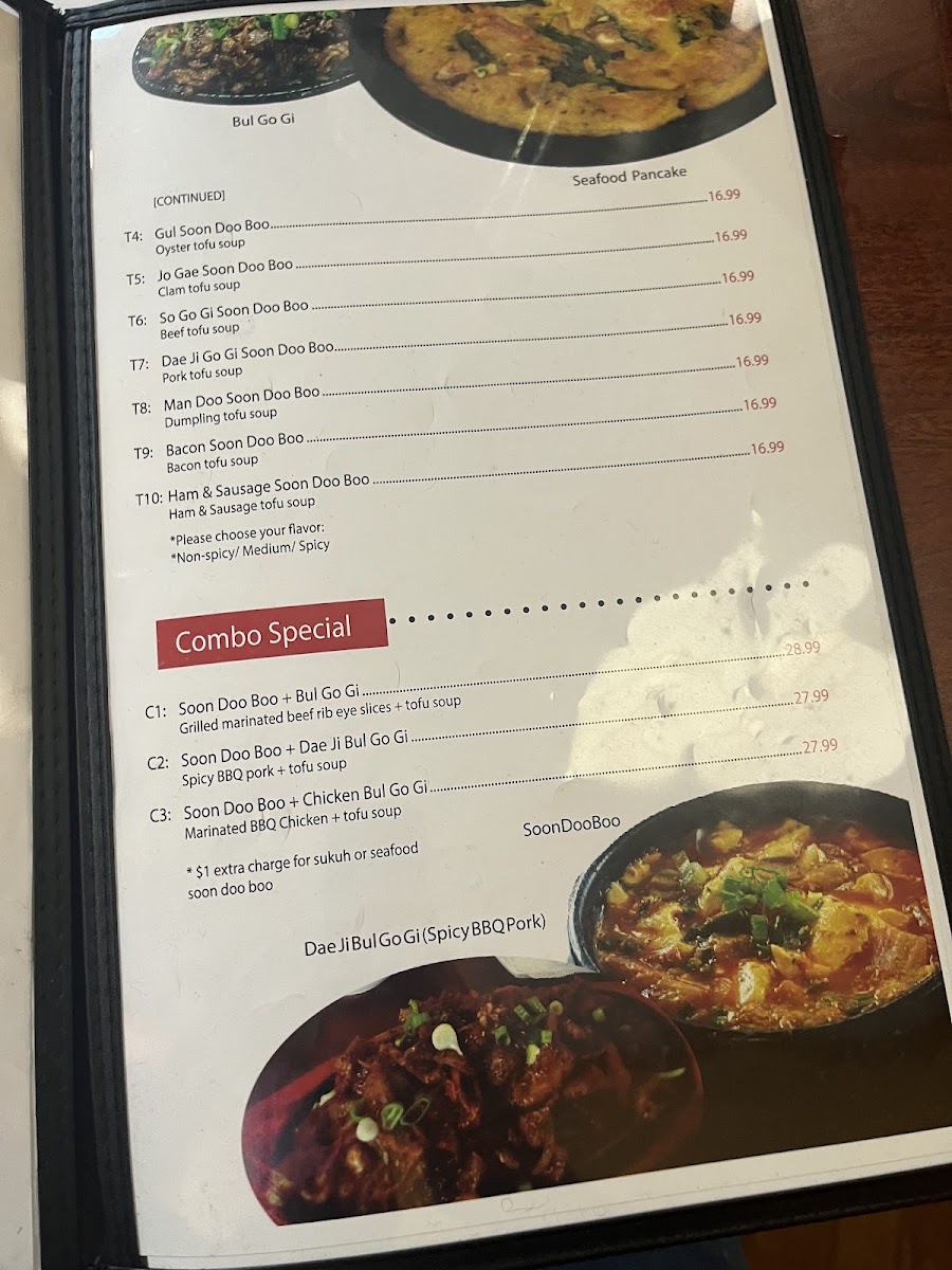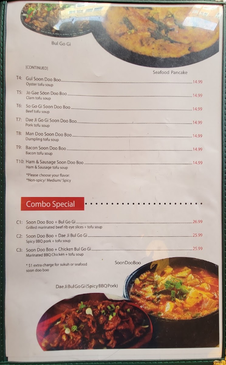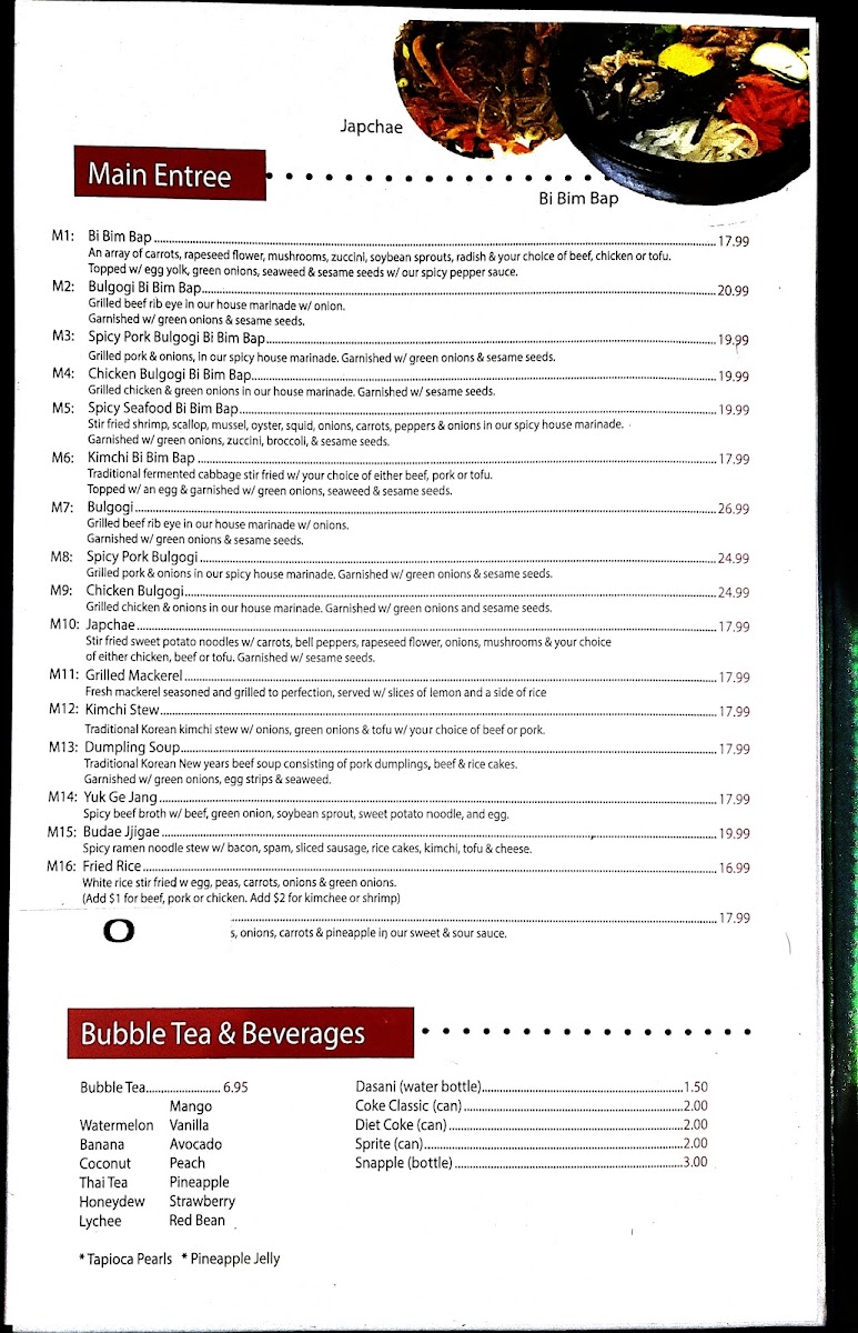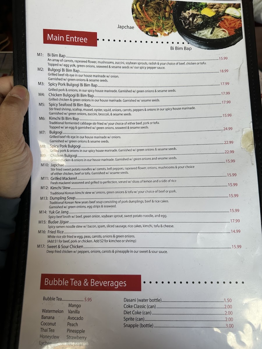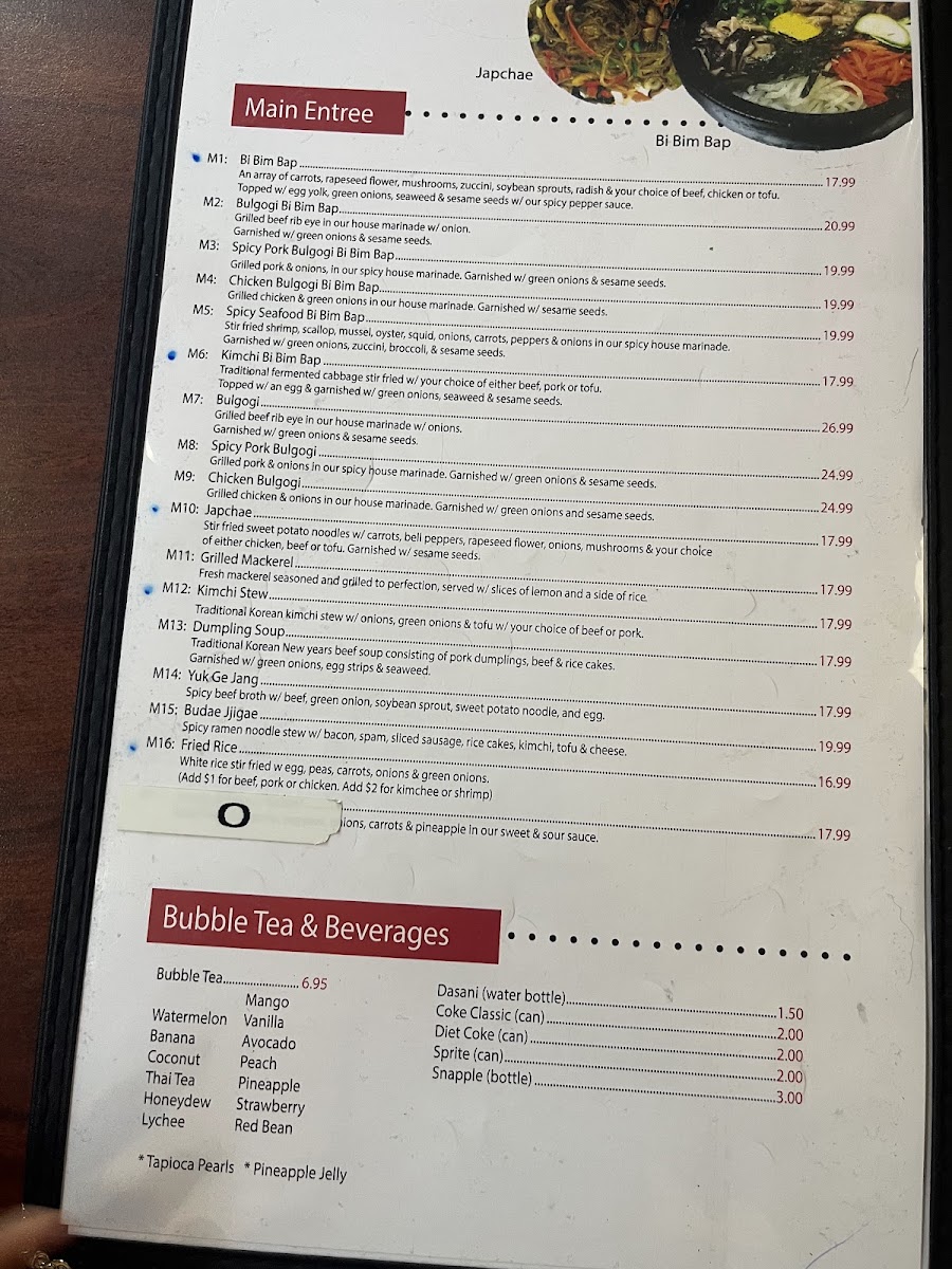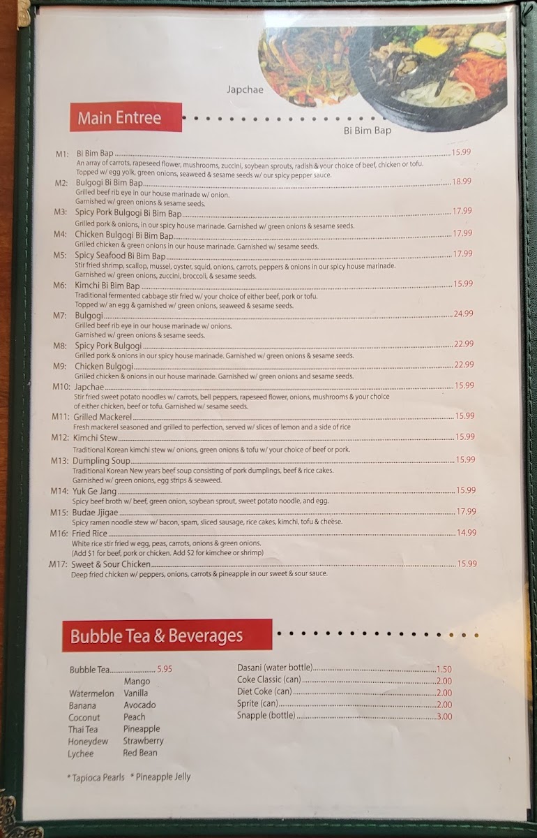 You'll find a variety of classic Korean flavors, from spicy bulgogi bibimbap and tender beef bulgogi to crispy Korean fried chicken wings and traditional kimchi pancakes. Appetizers and soups like hand-rolled fried dumplings and seafood tofu soups offer a pleasant start, while refreshing drinks such as bubble tea and house-made Snapple drinks provide a sweet balance.